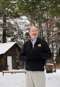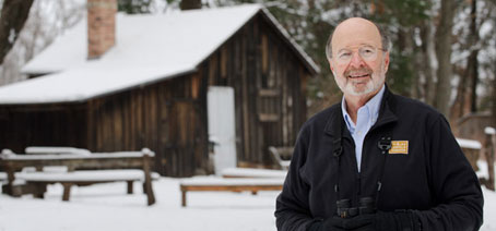 Stan Temple, emeritus professor of forest and wildlife ecology and senior fellow at the Aldo Leopold Foundation, is pictured in the snowy woods near the historic Aldo Leopold Shack in rural Baraboo, Wis., on Dec. 6, 2010. Photo: Jeff Miller