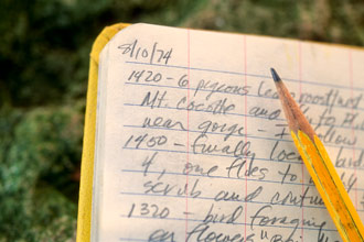 Pictured in 1994, a page from Temple’s field research notebook features handwritten notes from Aug. 10, 1974. Photo: Jeff Miller