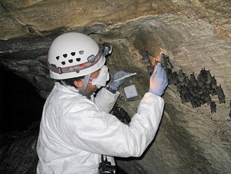 Pictured in 2008, a biologist takes samples from a cave in an early attempt to determine the cause of the deadly white-nose syndrome in hibernating bats. Scientists from the University of Wisconsin-Madison and other institutions confirmed that the fungus, Geomyces destructans, indeed causes white-nose syndrome, which is decimating bats in the Eastern United States and spreading rapidly through the Midwest.