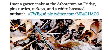 “We used to take five minutes at the beginning of class to talk about people’s observations, but with about 50 students enrolled in the course each spring semester, that wasn’t very efficient,” she says. “Now I can monitor the sightings on Twitter, and comment during class on those that are especially notable.”