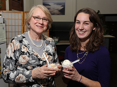 Hughes posed for the accompanying photo with CALS Dean Kate VandenBosch, who inspired the idea for the new product. VandenBosch—like 30–50 million other Americans, or about 10 percent of the U.S. population—is lactose intolerant, although she doesn’t let it get in her way.