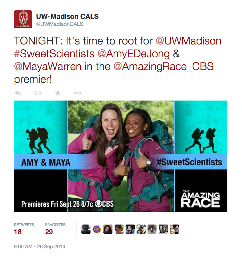 This summer CALS food science PhD students Amy DeJong and Maya Warren competed in the 25th season of The Amazing Race. The college’s social media community has been keenly interested in their adventures, sharing updates and words of encouragement as the show has unfolded this fall. The above tweet promoting the season premier, for instance, received more than 18 retweets and reached more than 15,000 people.