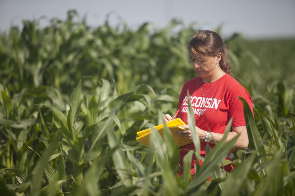 Natalia de Leon, Assistant Professor of Agronomy at UW-Madison and project lead at the Great Lakes Bioenergy Research Center, takes notes on experimental corn plots at the West Madison Agricultural Research Station. Natalia looks for differences in height, total biomass, color, disease, pollination time and other factors. Photo: cornbreeding.wisc.edu.
