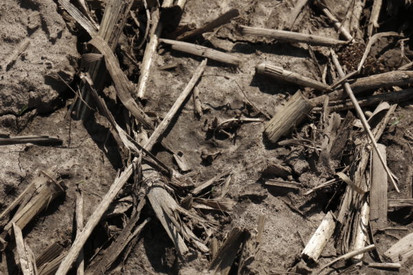 In mid-May, 2018, this bare cornfield awaits planting. Before vigorous growth begins, annual crops leave the soil wide open to wind and water erosion, as shown. Photo: David Tenenbaum