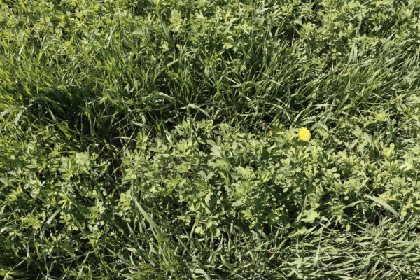 Kernza and alfalfa were planted in fall, 2016. The contrast shows one advantage of perennials like kernza, which cover the ground year-round. Photo: David Tenenbaum