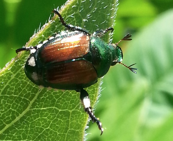 PJ Liesch: So the beetles themselves are just over a quarter of an inch long. The back side of the body, the wing covers or elytra are a shiny brownish coppery color, the rest of the body is green, but on the sides of the body there’s a series of tiny white dots that you can see pretty well. And if you’ve bumped into Japanese Beetles before, you probably recognize them because they can cause very significant damage to plants. Often what they do is chew holes and they tend to nibble around the tougher veins, so we get this lace-like skeleton of a leaf that’s left behind and we actually refer to that as skeletonization. And that’s a very characteristic type of damage that this insect causes to plants.