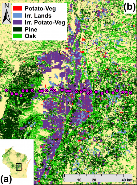 To find out, Nocco worked with private landowners to install 28 temperature and humidity sensors in a line that crossed through the Central Sands. The 37-mile transect extended from pine plantations in the west, over irrigated farms toward forests in the east. The researchers collected data across 32 months from the beginning of 2014 through the summer of 2016.