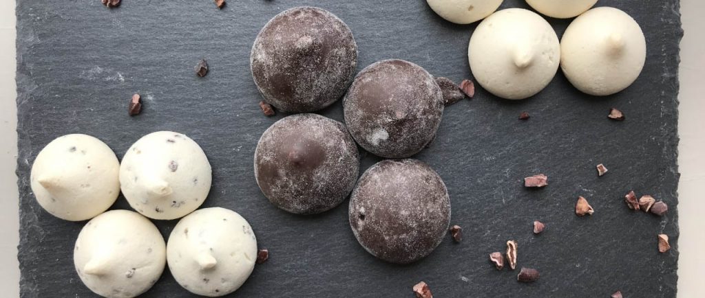 Trinipea is a shelf-stable vegan meringue cookie that the students developed in vanilla, dark chocolate, and cacao nib flavors. While traditional meringue cookies rely on whipped egg whites to achieve their light, delicate texture, for Trinipea the students turned to aquafaba, the leftover liquid from the chickpea cooking process. Aquafaba has a high protein and carbohydrate content, allowing it to be whipped into a foam just like egg whites.