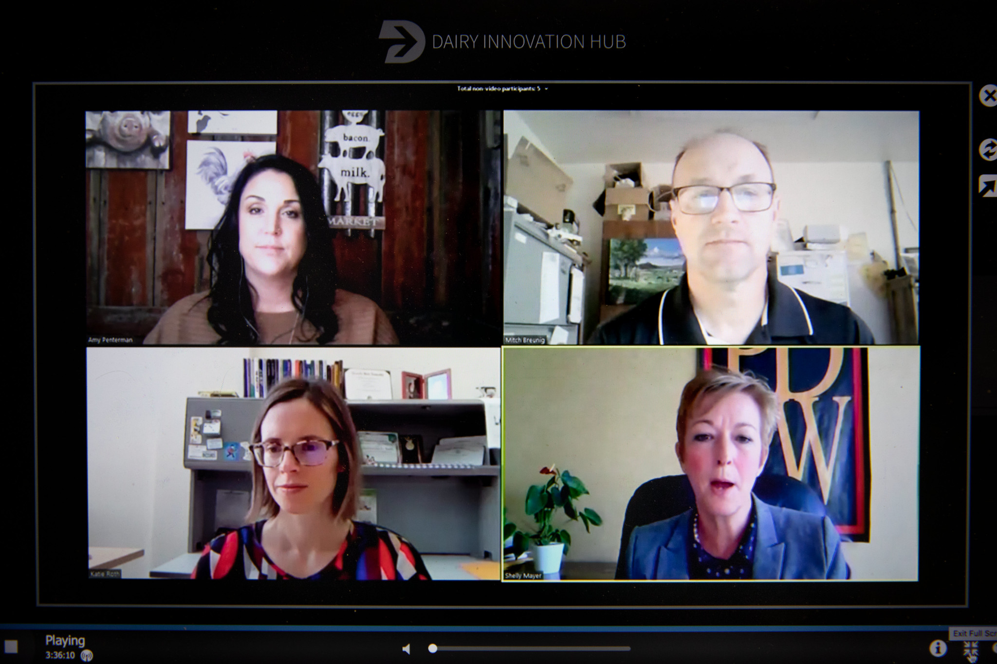 The dairy farmer panel included (clockwise from top left) Amy Penterman of Dutch Dairy in Thorp; Mitch Breunig of Mystic Valley Dairy in Sauk City; Shelly Mayer of Professional Dairy Producers of Wisconsin (moderator); and Katie Roth of Banner Ridge Farms in Platteville. Photo by Michael P. King/UW–Madison CALS.