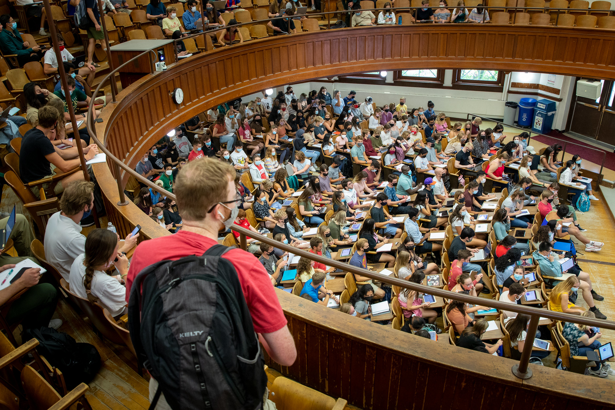 Students settle into their seats before the start of Biochem 501 (Introduction to Biochemistry) in the historic Agricultural Hall lecture hall on the first day of classes at UW–Madison of Madison, Wis., Wednesday, Sept. 8, 2021. Photo by Michael P. King/UW–Madison CALS.