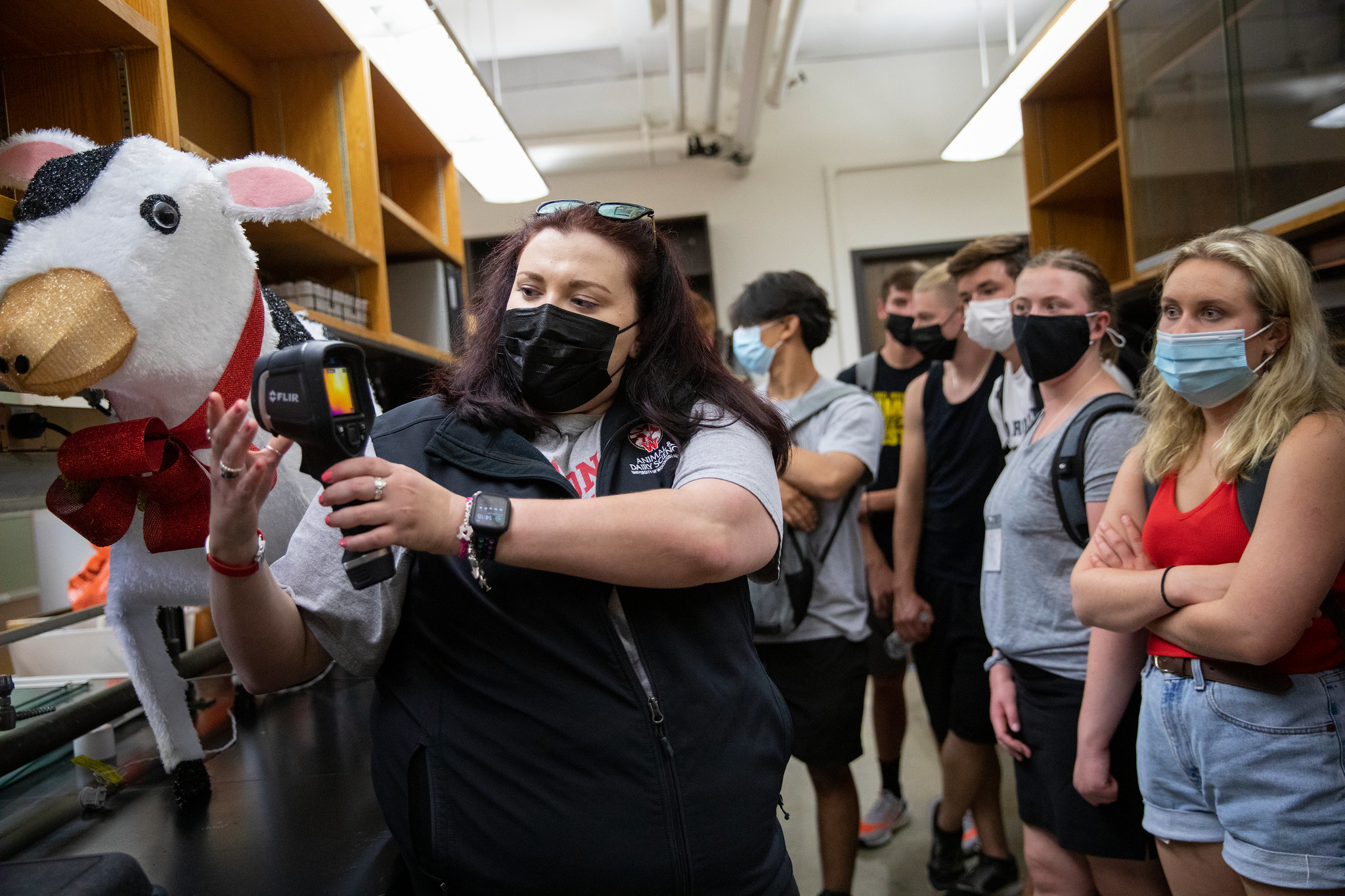 New CALS students tour the lab of Jennifer Van Os in the Department of Animal and Dairy Sciences at UW–Madison on Aug. 31, 2021. Kim Reuscher, a PhD student in the Van Os Animal Welfare Lab, demonstrates a thermal imaging camera to students doing lab visits. In the Van Os lab, researchers use a variety of technologies to study animal behavior from a biological perspective to better understand and improve the welfare of animals, particularly dairy cattle. Photo by Michael P. King/UW–Madison CALS.