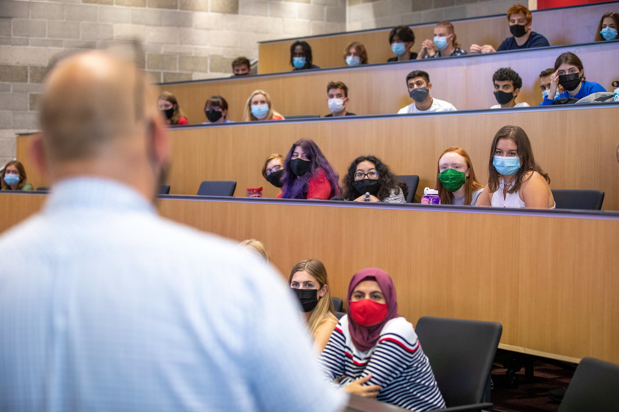 A classroom in the recently completed Meat Science and Animal Biologics Discovery Building hosts CALS QuickStart students attending a series of orientation panels during their first week on campus at UW–Madison in Madison, Wis., Wednesday, Sept. 1, 2021. Here, food science professor J.P. van Pijkeren provides information about the field of food science. Photo by Michael P. King/UW–Madison CALS.
