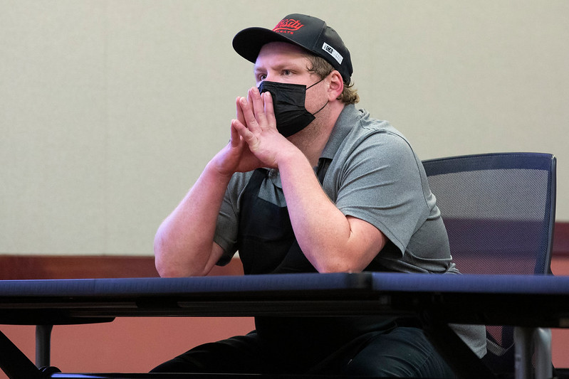 Mitch Monson, retail operations manager at Bucky’s Varsity Meats, listens to graduate students in business provide branding and marketing advice for the store during class presentations in Grainger Hall at UW–Madison in Madison, Wis., Tuesday, Dec. 14, 2021. Photo by Michael P. King/UW–Madison CALS.