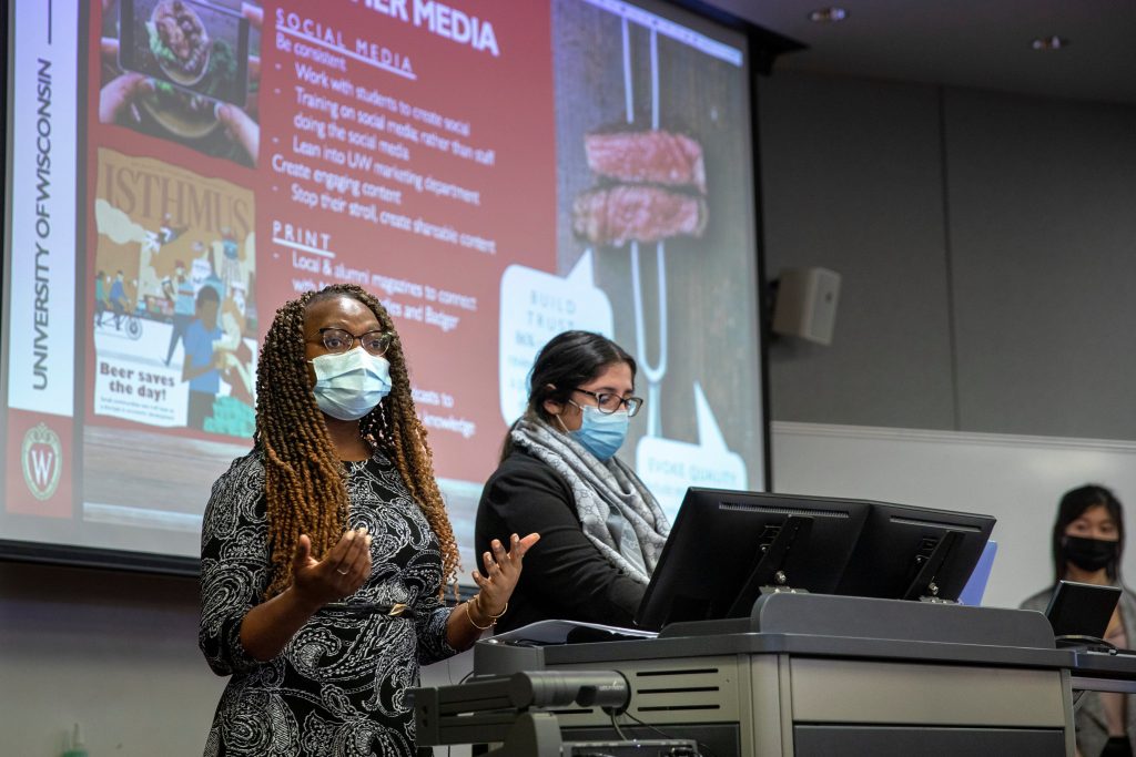 Joseline Nyinawabera presents branding and marketing advice for Bucky’s Varsity Meats with teammates Masuma Zulfakar, center, and Livia Xie, far right background, during class presentations in Grainger Hall at UW–Madison in Madison, Wis., Tuesday, Dec. 14, 2021. All are graduate students in business. Photo by Michael P. King/UW–Madison CALS.